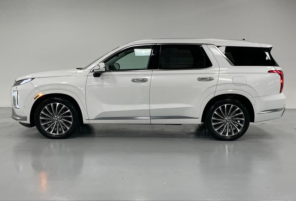 This Palisade is well equipped with Option Group 01, 12 Speakers, 3.648 Axle Ratio, 3rd row seats: split-bench, 4-Wheel Disc Brakes, ABS brakes, Air Conditioning, Alloy wheels, AM/FM radio: SiriusXM, Apple CarPlay & Android Auto, Auto High-beam Headlights, Auto-dimming door mirrors, Auto-dimming Rear-View mirror, Auto-leveling suspension, Automatic temperature control, Brake assist, Bumpers: body-color, Cargo Cover/Screen, Cargo Net, Cargo Tray, Carpeted Floor Mats, Compass, Delay-off headlights, Driver door bin, Driver vanity mirror, Dual front impact airbags, Dual front side impact airbags, Electronic Stability Control, Emergency communication system: Blue Link Connected Car Service (3-year complimentary subscription), Exterior Parking Camera Rear, Four wheel independent suspension, Front anti-roll bar, Front Bucket Seats, Front Center Armrest, Front dual zone A/C, Front reading lights, Fully automatic headlights, Garage door transmitter: HomeLink, harman/kardon® Speakers, Heads-Up Display, Heated & Ventilated Front Bucket Seats, Heated door mirrors, Heated front seats, Heated rear seats, Heated steering wheel, Illuminated entry, Knee airbag, Low tire pressure warning, Memory seat, Navigation System, Occupant sensing airbag, Outside temperature display, Overhead airbag, Overhead console, Panic alarm, Passenger door bin, Passenger vanity mirror, Power door mirrors, Power driver seat, Power Liftgate, Power moonroof, Power passenger seat, Power steering, Power windows, Premium Nappa Leather Seat Trim, Radio data system, Radio: AM/FM/MP3 Premium Audio System, Rain sensing wipers, Rear air conditioning, Rear anti-roll bar, Rear audio controls, Rear reading lights, Rear side impact airbag, Rear window defroster, Rear window wiper, Reclining 3rd row seat, Remote keyless entry, Security system, Speed control, Speed-sensing steering, Split folding rear seat, Spoiler, Steering wheel mounted audio controls, Tachometer, Telescoping steering wheel, Tilt steering wheel, Traction control, Trip computer, Turn signal indicator mirrors, Variably intermittent wipers, Ventilated front seats, Ventilated rear seats, Wheel Locks, and Wheels: 20" x 7.5J Calligraphy Exclusive Alloy.